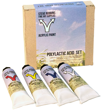 Polylactic Acid Acrylic PaintsSteve Robbins Fine Art Supplies™ is proud to announce a new experimental line of acrylic paint. After years of research and testing, we've developed a polymer emulsion made from polylactic acid, which is composed of synthetics derived from corn. (read more about polylactic acid here) This new polymer opens up new possibilities for renewable and sustainable manufacturing, and with this new emulsion developed by Steve Robbins Fine Art Supplies™ labs, new possibilities for todays working artists and hobbyists. Our new palette is limited to a handful of colors to choose from, but we expect to offer a full line in the next few years as more development and popularity grows for this thrilling new product that we are proud to call our own. |