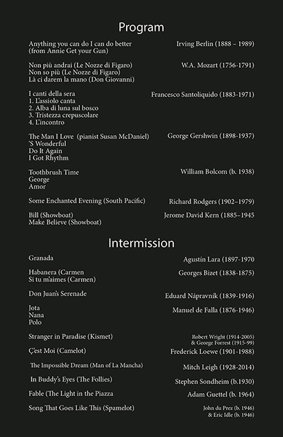 Belov & Penn. Of all the covers I've made, this is hands down the one I'm most proud of. I took two seperate photos of these two exceptional opera singers, and put the focus on their instruments: their mouths. This program actually has 6 pages, with 3 of them translating the foreign language lyrics, but I didn't include them here. Just 1 of them.